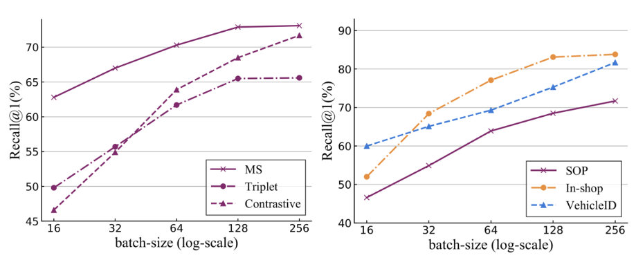 然而,无论是第一种方法的额外注重难样本,还是第二种方法的小范围采样,他们的难例的挖掘能力其实依然有一个天花板——那就是 mini-batch 的大小。这个 mini-batch 的大小决定了在模型中单次迭代更新中,可以利用的样本对的总量。因此,即使是很精细的采样加权方法,在 mini-batch 大小有限的情况下,也很难有顶级的表现。我们在三个标准图像检索数据库上进行了实验,基于三种标准的 pair-based 方法,我们发现随着 mini-batch 变大,效果(Recall@1)大幅提升。实验结果如下图: