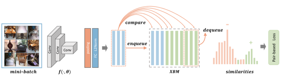 由此,我们希望另辟蹊径,得以在 mini-batch 有限的情况下,也能获得充足的难例样本对。首先,必须突破深度度量学习一直以来的一个思维局限——仅在对当前 mini-batch 里的样本对两两比较,形成样本对。以此我们引入了 XBM(Cross-batch Memory)这一方法来突破局限,跨越时空进行难例挖掘,把过去的 mini-batch 的样本提取的特征也拿过来与当前 mini-batch 作比较,构建样本对。