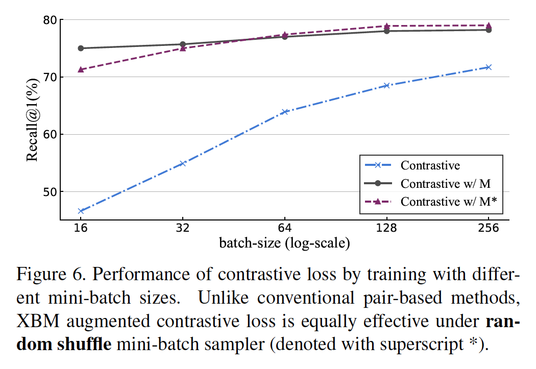 2、XBM 方法即便是使用很小的 batch (16), 也比没有 XBM 使用大的 batch (256) 效果好;