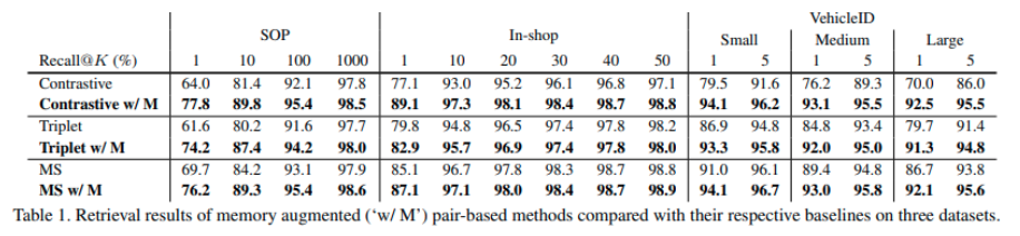 第二,其实 Memory 机制并不是本文原创,但是用 Memory 来做难例挖掘是一个全新的尝试。同样在 CVPR 2020 获得 Oral,也是由 Kaiming He 作为一作的 MoCo 也是这种思路。本文的方法其实可以认为是 MoCo 在 m=0 的特例,Kaiming 通过动量更新 key encoder,可以直接控制住特征偏移。作者认为,这种方法还会在很多任务带来提升,不局限于 Kaiming 的自监督表示学习,以及此前我们一直关注研究的度量学习(或者说监督表示学习)。