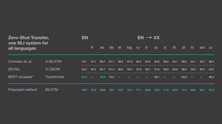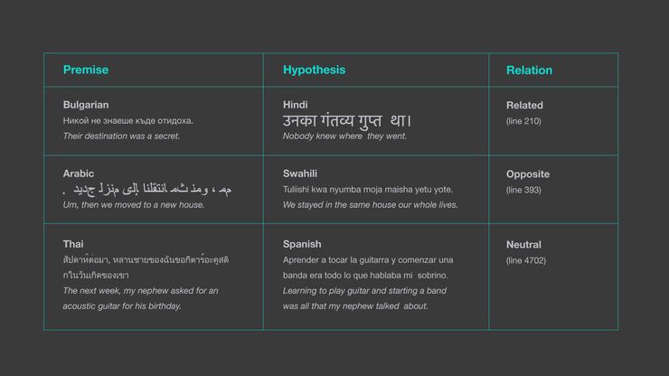 与此前要求句子一定要用英语表示的方法相比,Facebook 的系统完全可以使用多种语言,并且还支持任意组合不同语言的前提和假设。