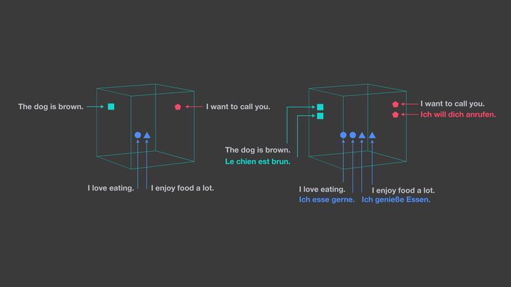 图左展示了一个单语嵌入空间;图右则展示了 LASER 的方法——将所有语言嵌入到一个独立的共享空间中。