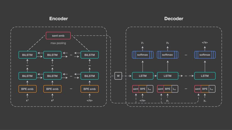 这些句子嵌入通过线性变换对解码器 LSTM 进行初始化,并在每个时间步连接到它的输入嵌入上。编码器和解码器之间没有其他的连接,因为 Facebook 希望通过句子嵌入来捕获输入序列的所有相关信息。