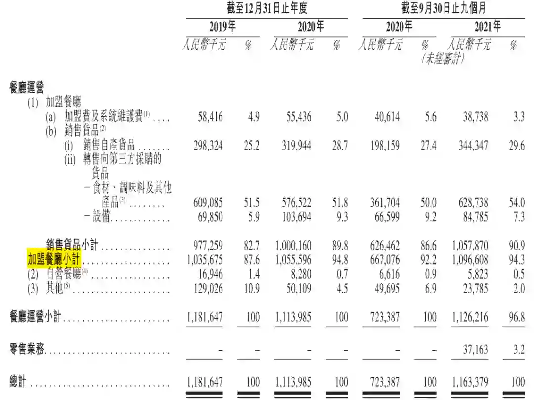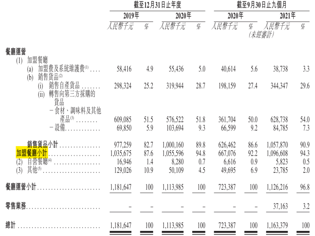 发展近六千家门店,对加盟餐厅收取加盟费、原料等费用,这部分收入占了大头。2019年,来自加盟餐厅的收入达到10.36亿元,占总营收的87.6%;2020年攀升至为10.56亿元,占总营收的94.8%。到2021年前三季度,这部分收入达到10.97亿元,占比为94.3%。