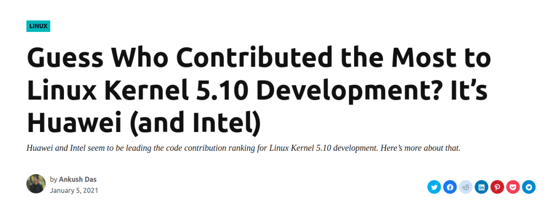 华为、英特尔是对 Linux 5.10 内核贡献最大的两家公司