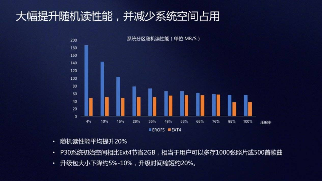 在 P30 系列发布会上,华为表示,比起安卓 Linux 内核的 EXT4 文件系统,EROFS 的随即读性能平均提升达 20%,在 4% 的压缩率时,性能提升甚至可以达到 288%。
