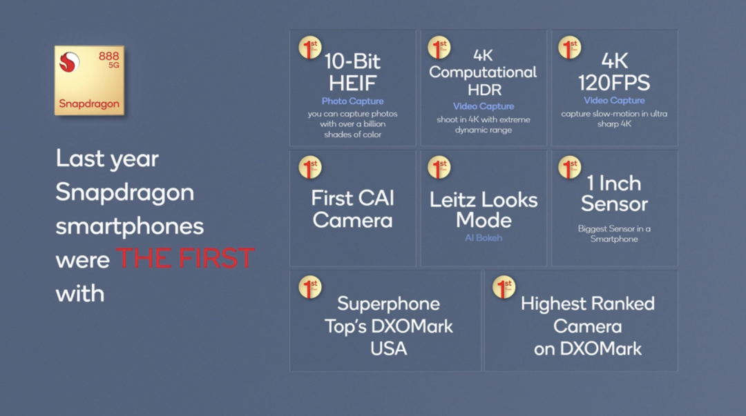 ISP方面,去年的高通骁龙888就拿下8个世界第一,支持10bit HEIF和4K HDR拍摄。