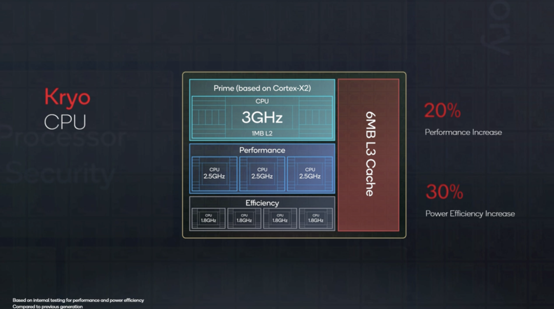总体来讲,全新Hexagon处理器,搭配Kyro CPU,Adreno GPU和Sensing Hub,AI峰值性能较前代再次大幅提升4倍。