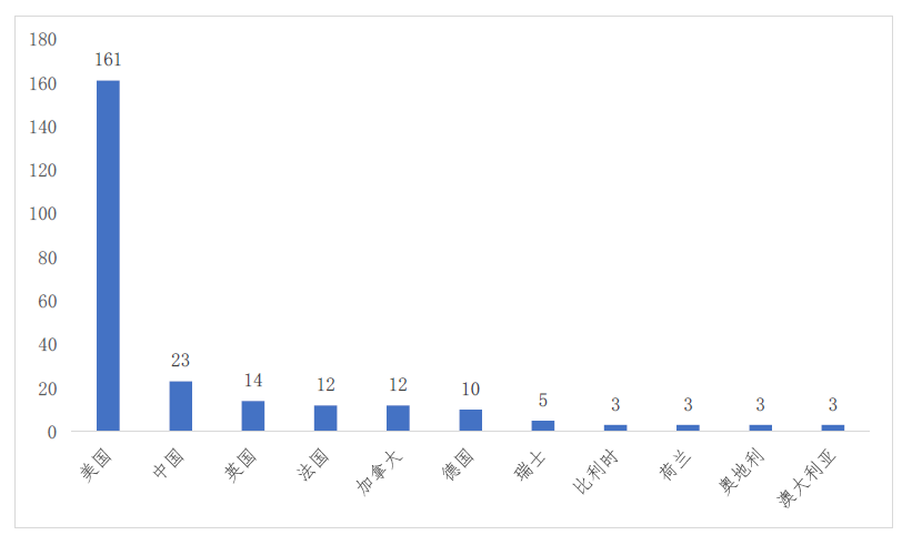 一、国别分布:美国共 161 人,占全球 61.5%;中国 23 人,占 8.8%