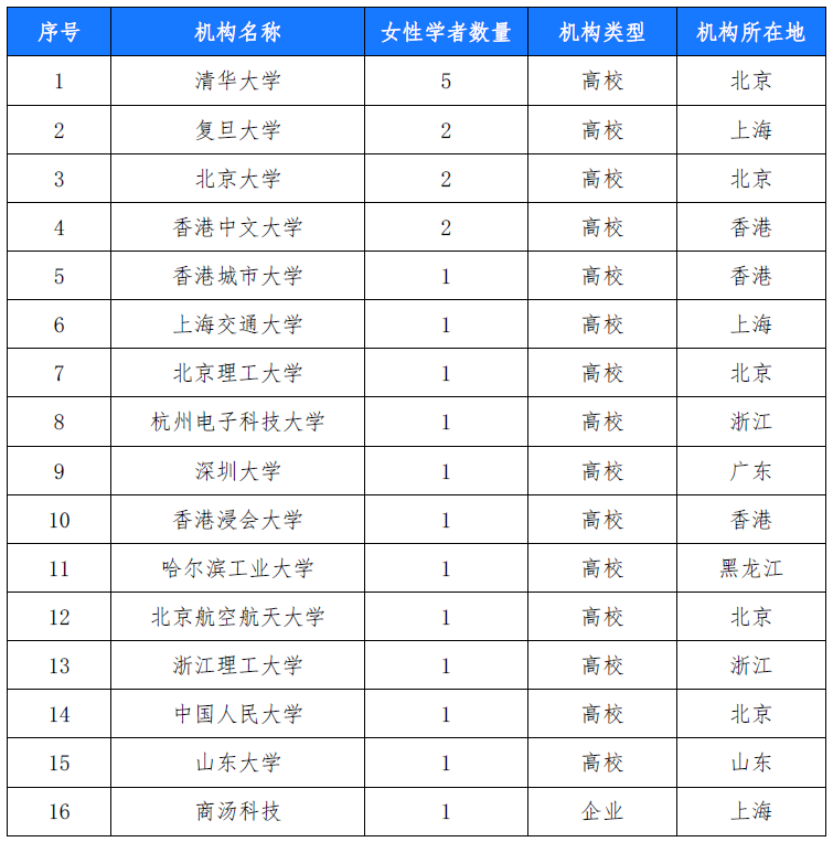 (二)我国女性学者分布在全国 16 家机构,其中商汤科技是唯一一家企业机构