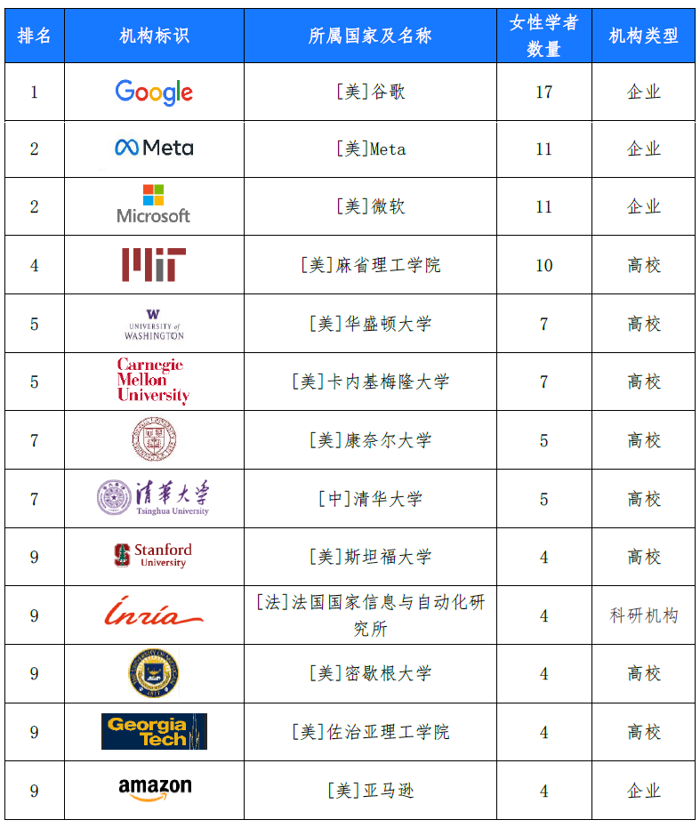 表1 人工智能相关领域全球女性学者数量前十强机构