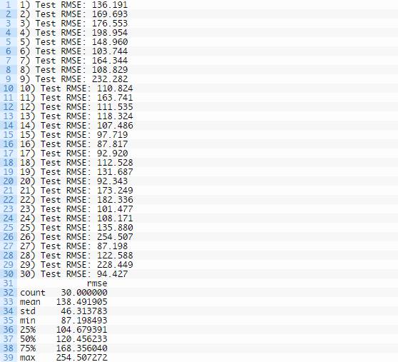 运行示例,打印每次重复的均方根误差分值。运行到最后将给出收集的均方根误差分值的总结统计数据。