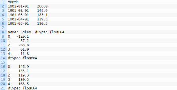 运行示例,打印载入数据的前5行,然后再打印差分序列的前5行,最后再打印序列逆转差分操作后的前5行。