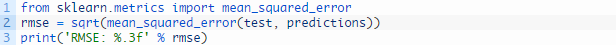 最后,收集所有测试数据集的预测,计算误差值总结该模型的预测能力。采用均方根误差(RMSE)的原因是这种计算方式能够降低粗大误差对结果的影响,所得分数的单位和预测数据的单位相同,即洗发水月度销量。