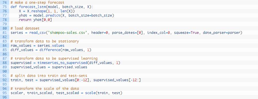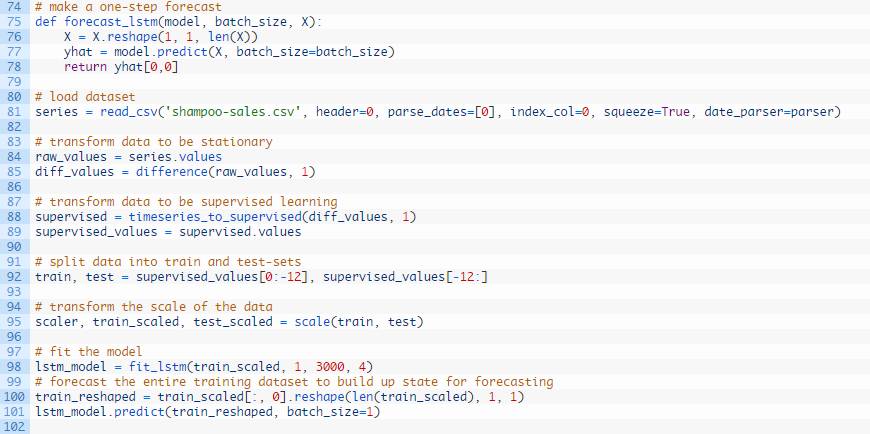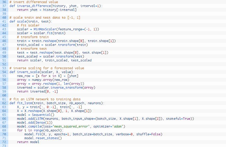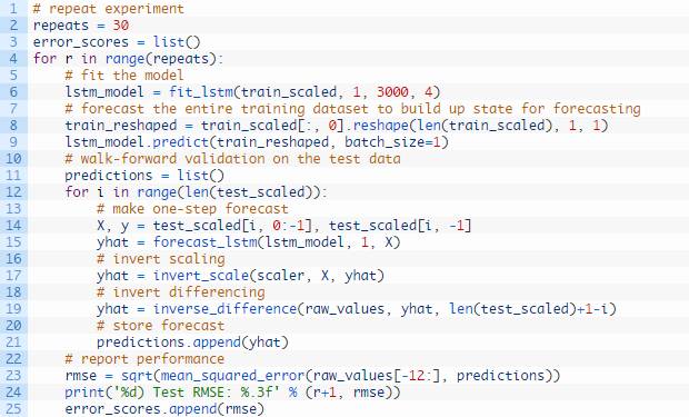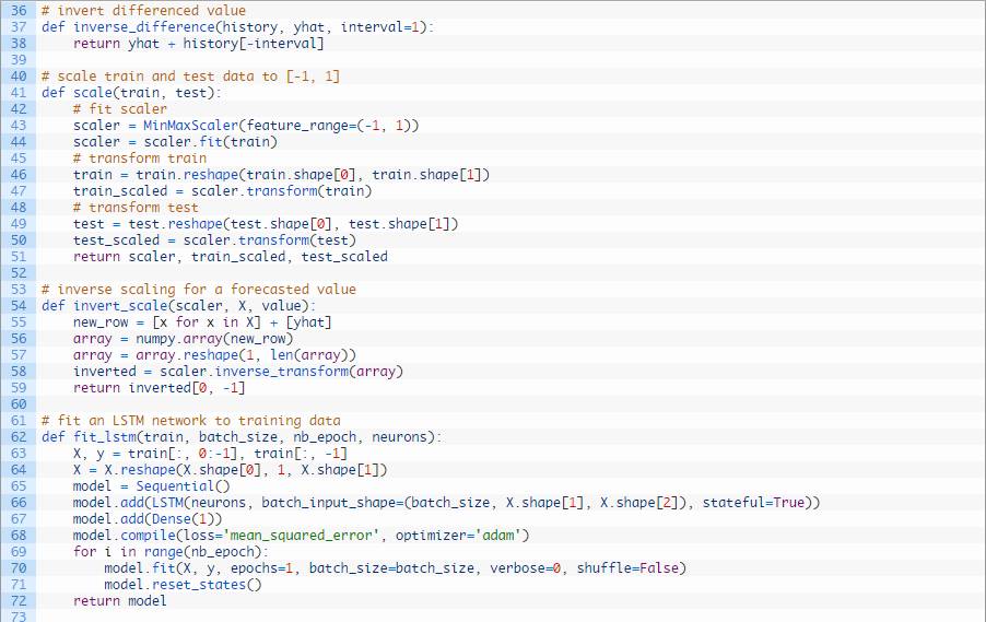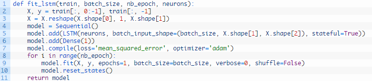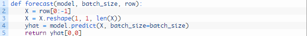我们可以在下列这个名为forecast()的函数中发现这种行为。给定一个合适的模型,拟合模型(例1)时的一批数据和一行测试数据,该函数将从测试数据行中分离出输入数据,对其进行改造,然后以单一浮点值的形式返回预测。