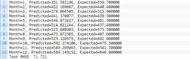 示例还打印了所有预测值得均方根误差。该模型显示洗发水月度销量的均方根误差为71.721,好于持续性模型得出的对应结果136.761。