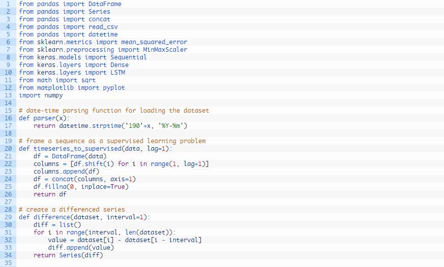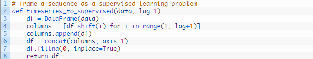 下方的代码定义了一个完成此步的辅助函数,名称为 timeseries_to_supervised()。这个函数由原始时间序列数据的NumPy数组和一个滞后观察值或错位的序列数生成,并作为输入使用。