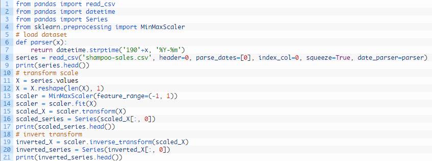 为了保证该试验的公平,缩放系数(最小和最大)值必须根据训练数据集计算,并且用来缩放测试数据集和任何预测。这是为了避免该实验的公平性受到测试数据集信息影响,而可能使模型在预测时处于劣势。