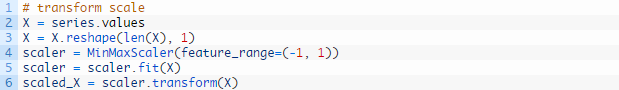 我们可以使用MinMaxScaler class转化数据集使其处在 [-1, 1] 区间内。和其他scikit-learn转换模块一样,它需要提供行列矩阵形式的数据。因此,我们必须在转换数据集之前变换NumPy数组。