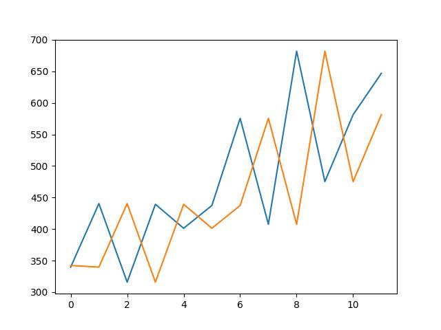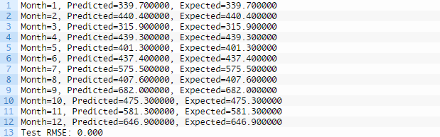 运行示例,打印测试数据集12个月份中每一月份的预期和预测销量。