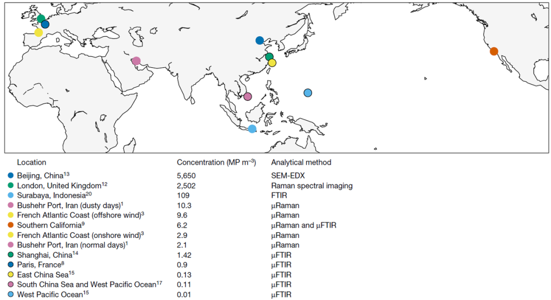 研究人员表示,在一些地区测得的高浓度也可能是由于采样点的位置处于特大城市的原因。相比之下,偏远地区的环境中空气传播的微塑料浓度通常较低,在法国大西洋沿岸的陆上风中测得的微塑料浓度平均为离岸风中测得的三分之一。