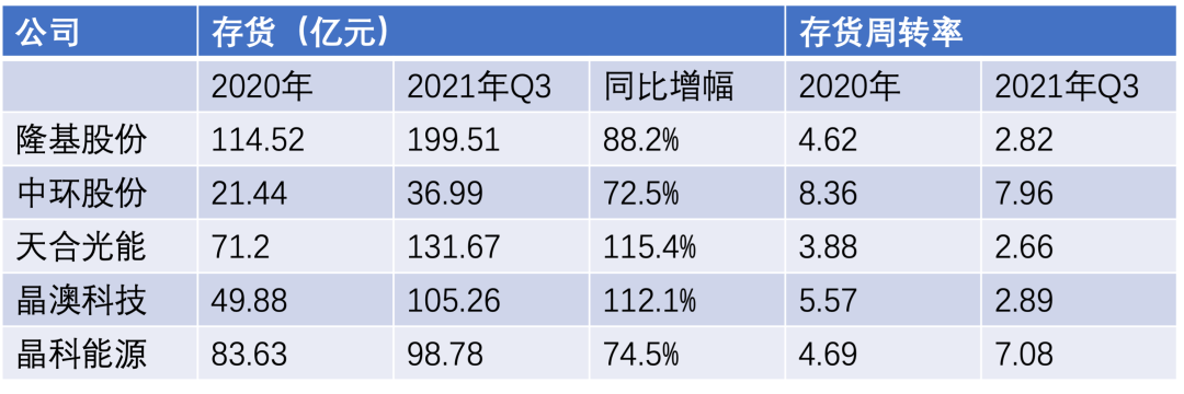 压力顺着产业链层层累积,下游装机的积极性大受打击,反过来又制造了上游的“库存危机”。隆基股份2021年三季度存货价值高达199.51亿元,以光伏组件为主;存货周转率则从2020年同期的4.62次缩水至2.82次。晶澳科技和天合光能的存货分别同比增长112.09%和115.36%,存货周转率同样呈现明显下降趋势。