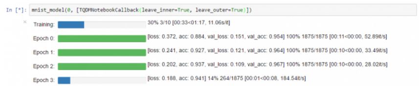 要想使用它,你仅需要从 keras_tqdm 中加载 TQDMNotebookCallback 类,然后将它作为第三个回调函数传递进去。