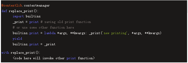 在下面的代码中,我们可以使用上下文管理器暂时重写 print 函数的行为:
