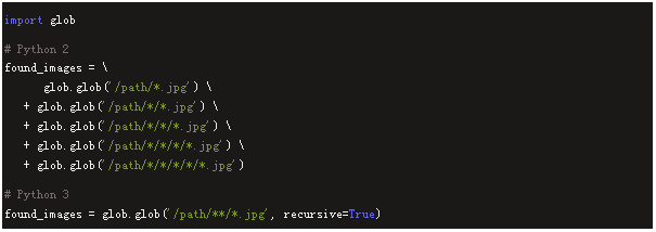 递归文件夹的通配符在 Python2 中并不是很方便,因此才存在定制的 glob2 模块来克服这个问题。递归 flag 在 Python 3.6 中得到了支持。
