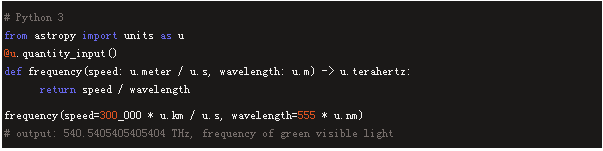 例如,计量单位是科学界的一个普遍难题,astropy 包提供一个简单的装饰器(Decorator)来控制输入量的计量单位,并将输出转换成所需单位。