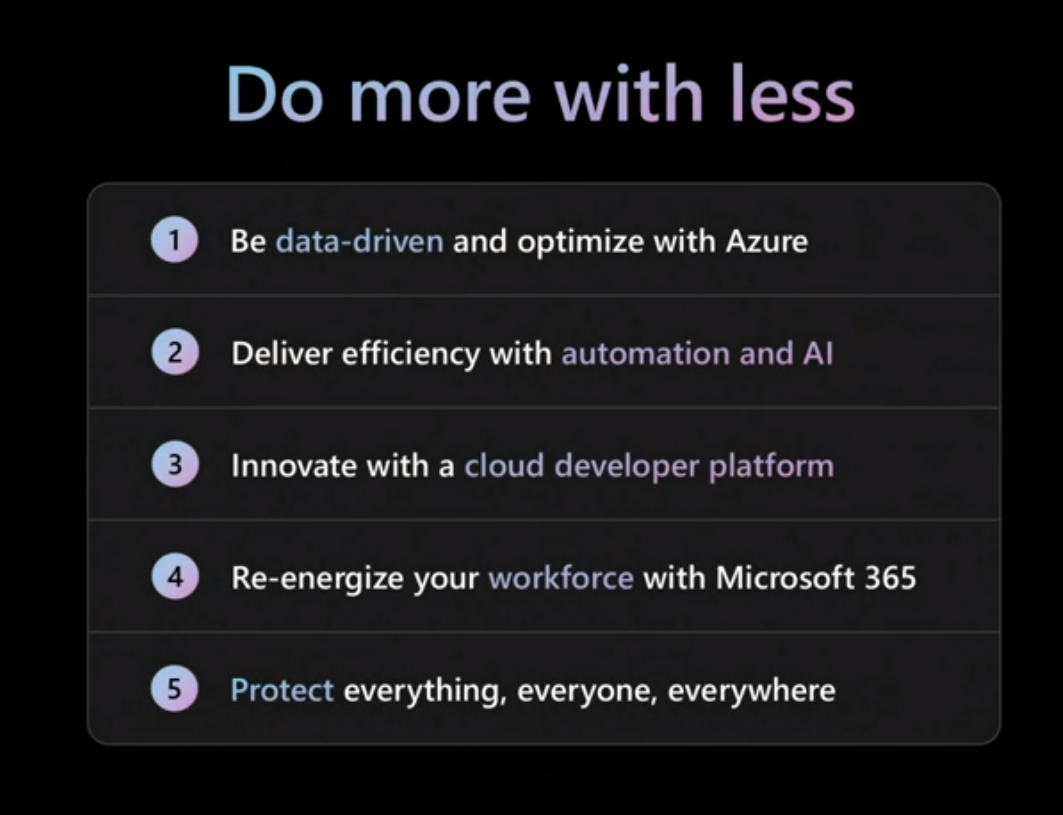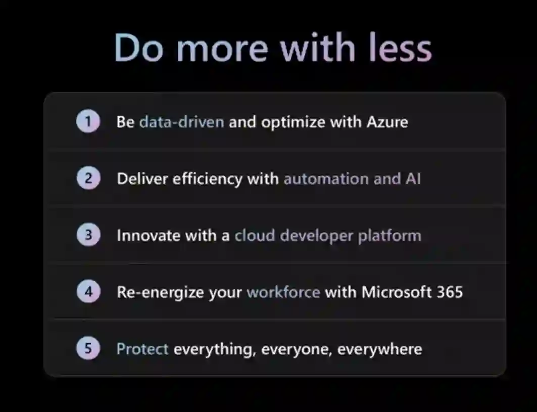 大会伊始,微软 CEO Satya Nadella 表示,我们正处于经济、社会和技术变革的历史性时期。尽管我们遇到各种不确定性,但有一点是明确的:每个行业的组织都在借助数字化能力来帮助他们用更少的资源来做更多的事情,以驾驭时代的变化。如何用更少的时间、更少的成本、更少的复杂性来实现更多的创新、更大的灵活性和更大的弹性?微软云服务从以下五点来协助企业降本增效,达到事半功倍的效果:数据驱动增强业务韧性、AI+自动化推动降本增效、使用创新的工作方式来赋能员工、使用云开发平台来加速创新、随时随地,安全随时。在基础架构上,Azure 拥有海量计算能力、可扩展的存储能力、优质性能网络,搭载业界高可用区域(AZ)技术,为虚拟计算提供 99.99% 可用性 SAL 支撑。注重安全建设,年投资超过 10 亿美元,由 8500 名安全专家专业守护。目前 Azure 部署到全球 60+区域,拥有超过 100+ 种服务。在技术上,通过数据和人工智能来帮助企业降本增效。在“AI+云”战略策略下,我们发现 Azure 通过提供丰富的 AI 技术,致力将 AI 变成企业的一种能力,企业通过这项能力来实现业务的创新和产品迭代。Azure 还提供一体化的微软智能数据平台,帮助企业实现数据驱动业务发展。Azure 为开发者提供完善的云平台开发,在开发的过程中,开发者希望拥有从开发到部署、运维的一站式工具,而全球应用最广泛的开发工具平台 Visual Studio 和 Azure 云服务做集成,有效帮助企业和开发者提高研发效率。研发出应用后,如何在云端进行快速的部署和扩张?开发者可以轻松地将代码或容器托管到 Azure,帮助开发者在全球范围内来快速实现代码部署。微软全球资深副总裁、微软大中华区董事长兼首席执行官侯阳博士总结道,“我们在本次大会上所说的‘事半功倍’,就是要充分发挥微软智能云的潜力和优势,通过发掘数据智能、强化协作能力、自动化商业流程,尽可能地在控制成本投入的同时,提升企业生产、运营、创新的效率,帮助更多的企业和合作伙伴在日趋激烈的市场竞争中斩获先机,赢得未来。”在本次大会上,微软全球发布了超过 100 项新服务和新功能,这些新服务和新功能的技术创新点正是围绕以上五大领域展开。