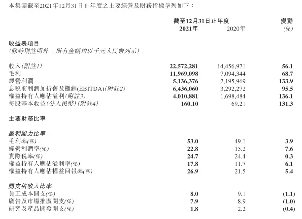 再细看2021年数据,其毛利上涨68.7%至119.69亿元人民币,集团整体毛利率达53.0%,较2020年的49.1%上升3.9个