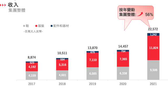 从目前已披露的财报数据来看,李宁在2019、2020、2021的全年营收分别为138.7亿、144.57亿、225.72亿,同比增长分别为32.0%、4.2%、56%,整理来说实现了持续性营收增长。