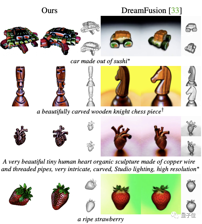 而在具体效果上,Magic3D的生成结果也更细节一些,比如下面的“仙人掌”、“房子”和“草莓”等(左为Magic3D,右为DreamFusion)。