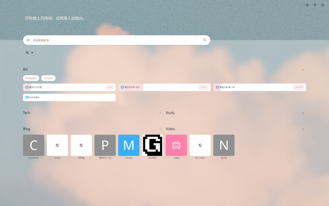 的新标签页插件,以收藏夹为核心,让你重新关注埋藏在收藏夹深处的「宝藏网页」,帮助你完善追番刷课体验。