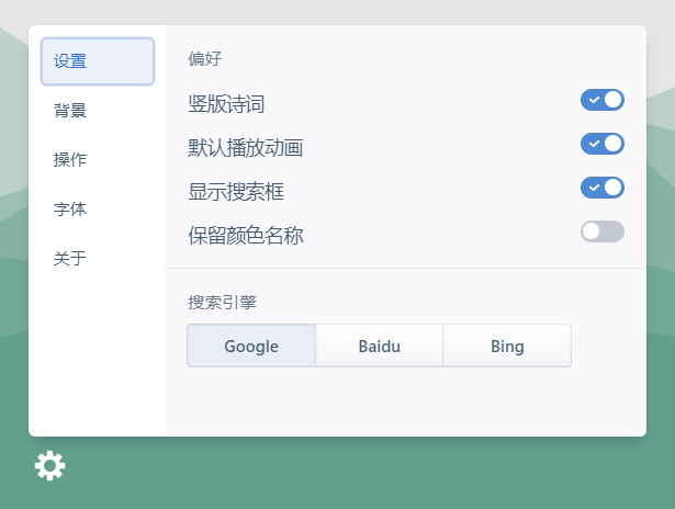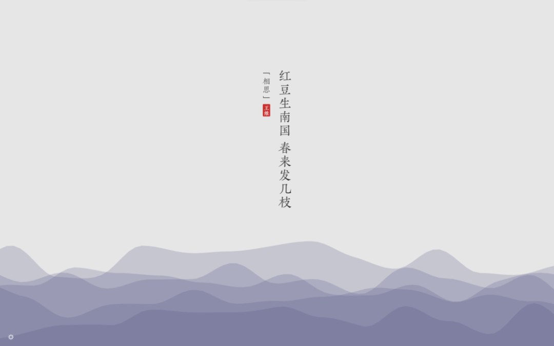 几枝以波纹或是浮墨的形式展示中国传统色彩的层叠效果。初入页面或切换色彩时,颜色名称会在右上角浮现,后逐渐隐去。若遇上心爱的色彩,Alt/Option + S 即可保存此刻美好,又或是在「设置 - 关于」中查看色号。你可以通过左右按键来随即切换色彩,按下空格让波涛定格,在设置中选择是否隐去色彩芳名。
