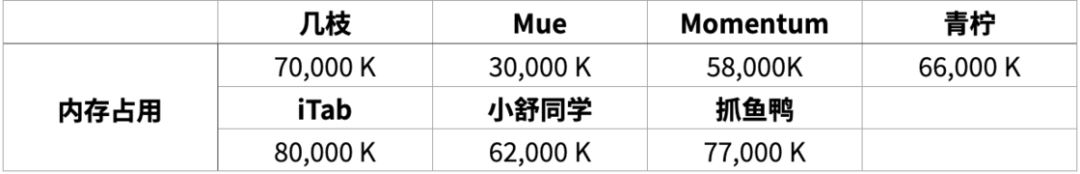 七款启动页对内存的占用大多集中在 60,000 K 到 80,000K 之间(数据来自 Edge 浏览器任务管理器),对于绝大多数用户的电脑来说,并不会有太大的负担。但如果你的内存十分有限或不希望被浏览器标签页占用过多的内存,Mue 是七款标签页中内存占用表现最优的。