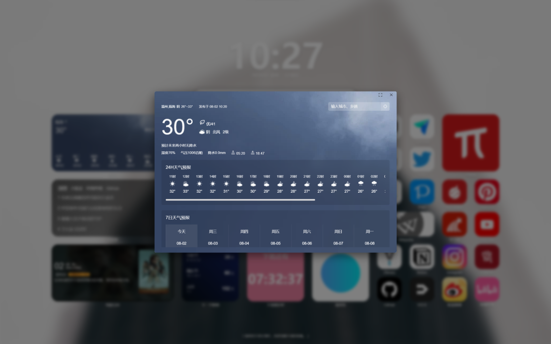 iTab 的小组件在不同布局下都可以充分利用显示面积,展示尽可能完整的信息。在单击小组件后,弹出的「App」则可以展示更加详尽的数据和图标,你也可以将「App」最大化,获得更好的浏览体验。天气小组件使用了和风天气作为数据来源,提供了概况、24 小时预报、7 天天气预报和生活指数信息。