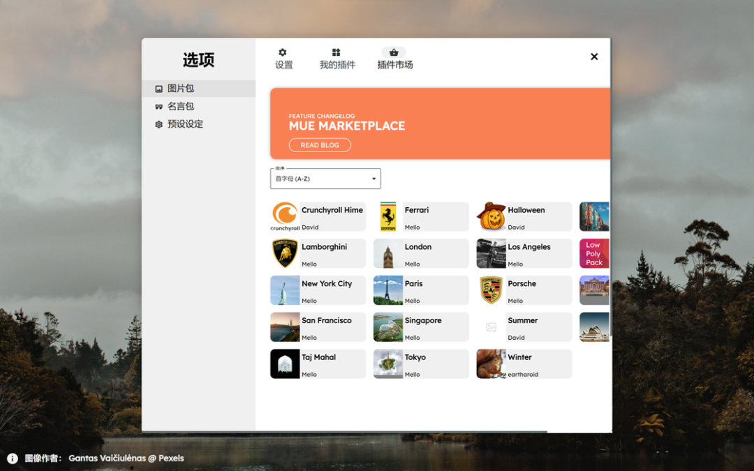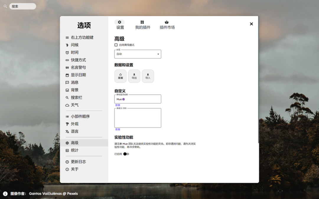 Mue 最亮眼的部分在于它的丰富的背景图片,你可以选择来自网络 API 的图片、随机纯色/渐变色背景,如果都不能满足你的需求,也可以自定义背景图像或者使用视频作为背景。Mue 提供了 Mue、Unsplash 和 Pexels 的背景来源,你可以按照喜好选择。插件市场也提供了几个背景包可供扩展。