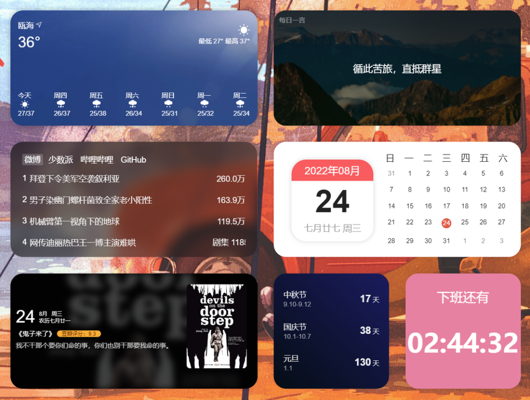 iTab 的热搜榜则提供了几十个网站的热搜聚合,让我在浏览器就能「纵览天下大局」,我在热搜榜中放置了微博、少数派、哔哩哔哩和 GitHub,有效提高吃瓜效率,实时关注大鸽动向。倒数日则聚合了节日倒计时、倒数日、正计时和下班倒计时功能。前三者让我不会忘记重要的纪(假)念(期)日,下班倒计时则可以帮助我更好把握摸鱼时机,也让我对美好生活重新充满向往。