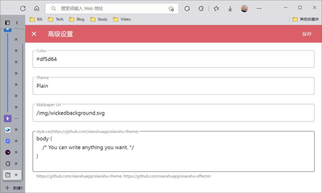 Mue 和小舒同学则选择了开放自定义 CSS。如果你恰好熟悉 CSS,可以通过 CSS 修改界面中几乎所有元素的属性。