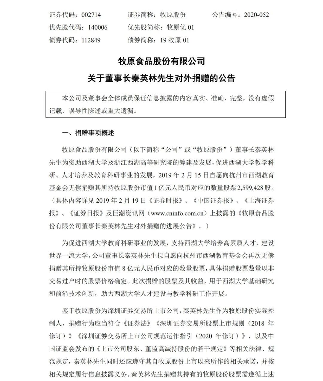 4 月 19 日,牧原股份发布公告,称为促进西湖大学教育科研事业的发展,支持西湖大学培养高素质人才、建设世界一流大学,公司董事长秦英林拟自愿向杭州市西湖教育基金会再次无偿捐赠其所持牧原股份市值 8 亿元人民币对应的数量股票,具体捐赠股票数量以非交易过户时的股票价格确定。