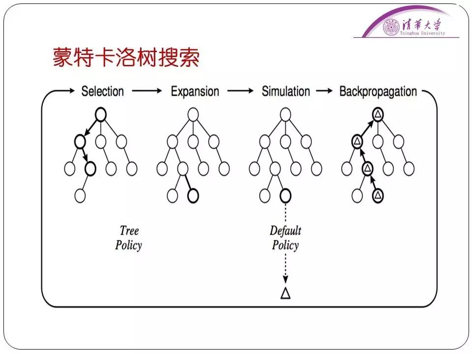 同时在蒙特卡洛树搜索中,采用了一种叫做“信心上限”的决策方法,也就是“多臂老虎机”决策问题。每个老虎机有一定的概率赢钱,多个老虎机,不同的老虎机赢钱的概率不一样。所以我可以站在旁边先看别人玩,先找到赢钱概率最大的决策方法。在模拟选择分支的时候,就把每一条路径看做一个老虎机。这之后选择最优路径然后继续随机模拟。模拟一轮后可能有胜有负,看胜率多少,然后把胜率最高的步骤传回。