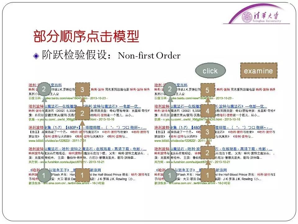 它的分析方法就是用户会不会继续向下检验是和当前文档的位置有关,也和前次被点击文档的距离有关。虽然这个模型效果已经不错了,但是里面仍然存在着问题。比如说这个模型是建立在“顺序浏览”假设上的。“顺序浏览”假设是指用户从上到下按顺序浏览,不考虑有“回访”的情况。