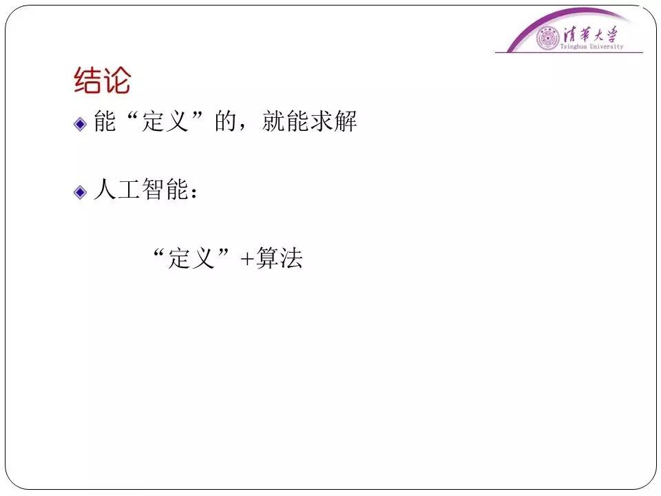 这里面对于人工智能领域提炼出来一个原则就是,能说清楚的,能做;说不清楚的,至少现在还做不好。但是技术是在发展的。人工智能的发展就是由“说不清”变得“说得清”,也就涉及到了描述的问题和相应的算法求解的发展。比如说围棋,过去没找到方法,“说不清”,但是谷歌突然间有了这种方法,把围棋说得清了,计算机围棋问题也就解决了。也就是说能“定义”的就能求解。这个定义不是说简单的一个文字,一个形式化的东西。现在的人工智能就是一个“定义”再加上算法来求解问题。那么这些就是目前我们人工智能能够做的。