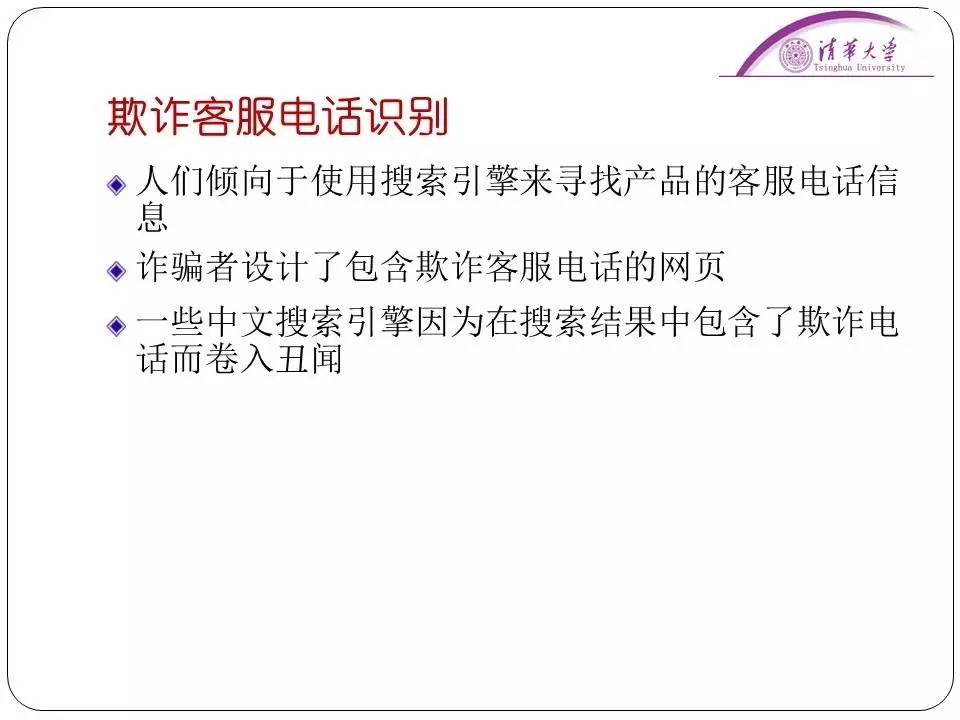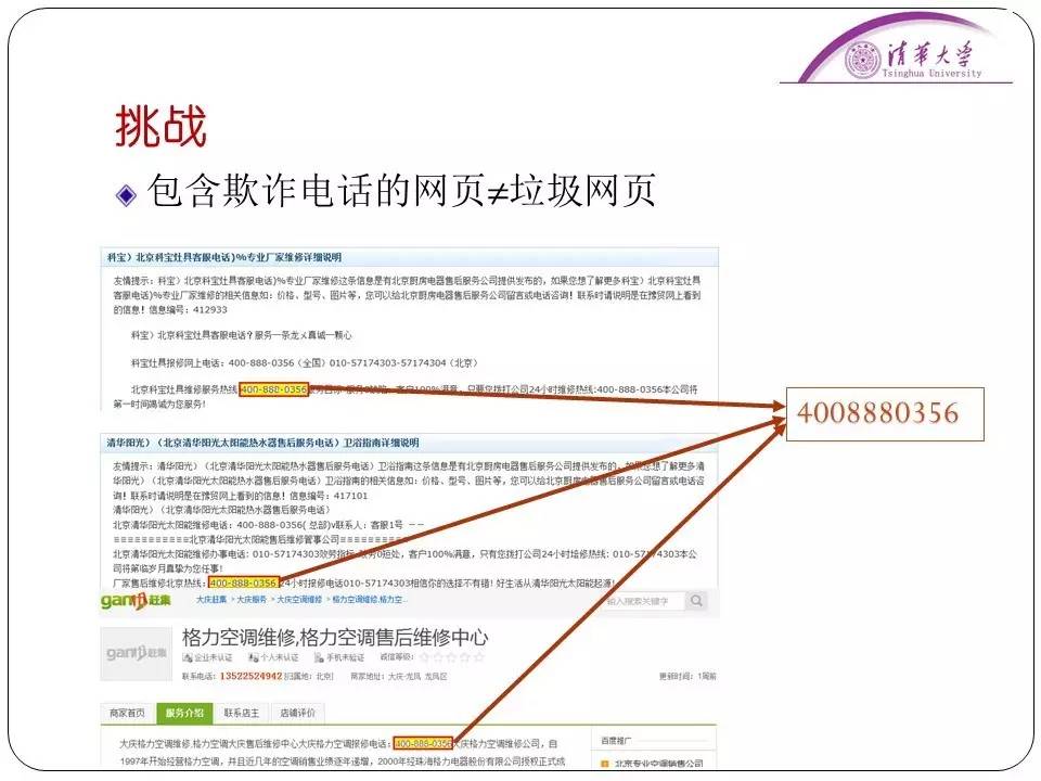 这种涉及到搜索引擎的诈骗问题也让很多公司苦恼,甚至还有很多公司因为这个问题被诉讼了。我们当时也觉得这种欺骗电话识别很难做。因为诈骗网页完全可以照抄厂家的官网,只是上面的客服电话不一样。后来调研了一番,我们发现这个问题实际上是可以被描述清楚的。这里面有哪些挑战呢?有的网站并不属于我们定义的垃圾网页范畴,所以采用垃圾网页识别的方法并不能很好的解决这个问题。