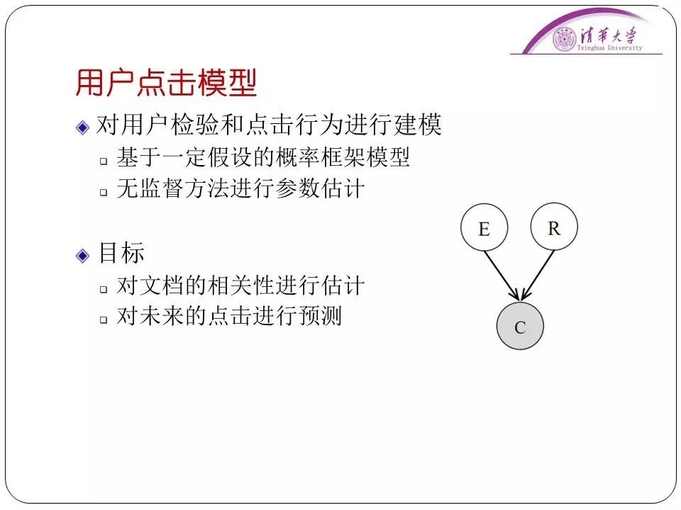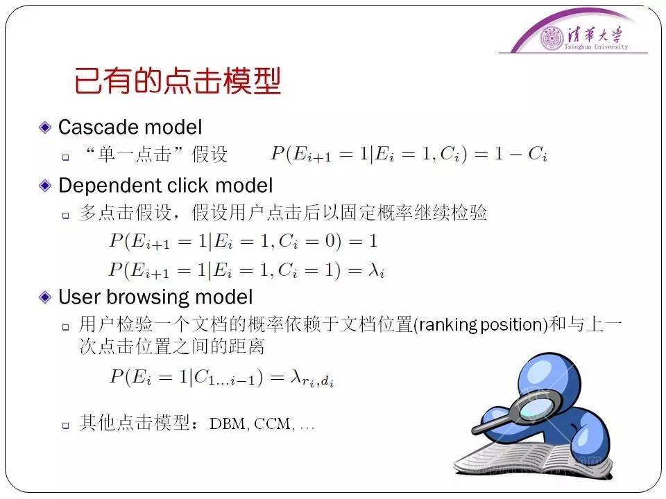 另外一个例子,就是用户点击模型。这其实是一个“前人栽树,后人乘凉”的工作,把搜索引擎上面的用户反馈情况记录下来分析用户需求。有一个简单的想法点击量越高越有可能是用户想要找的东西。