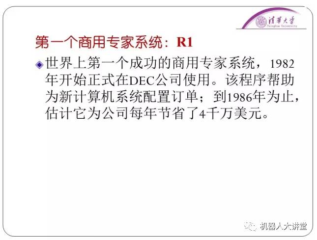 还有比如世界上第一个成功的商用专家系统R1。82年开始在DEC公司使用,是用来代替向厂家订货的工作的。当时据说可以节省4000万美元一年,它通过几千条的规则,覆盖了所有可能出现的情况。