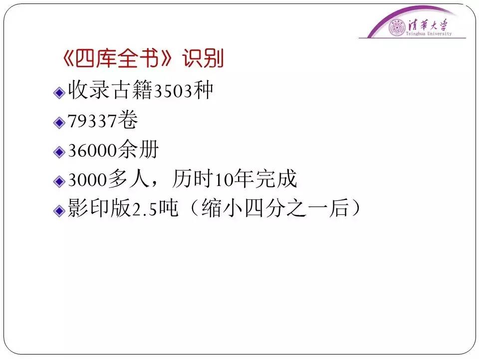 这个《四库全书》是当年三千多人一起抄写了十年才完成的。现存的完整版分别保存在国图和台北。但是要查询《四库全书》的内容就非常难了,当时台湾出版过影印版,整体缩小四分之一,最后一套书的重量有两吨半。因此很多人想出版成电子版。90年代的时候很多公司抢着想做这件事情。甚至还有公司在人民大会堂抢先开了新闻发布会,当然他们最后也没做成。这些人都想找人采用人工录入的方式,但是都没有成功。