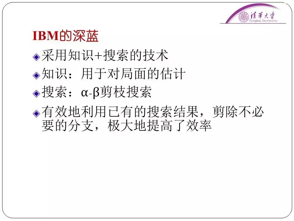 再有一个是IBM的深蓝系统,1997年,在国际象棋比赛当中战胜了国际象棋大师卡斯帕罗夫引起了世界的轰动。其实深蓝系统的主要算法叫做“alpha-beta剪枝算法”,这个算法很早被提出来了,但是直到深蓝系统才获得了很大的成功。这个算法依赖于局面的评估,在当前的局面下是对我有利还是对对方有利。IBM聘请了很多的象棋大师来为他总结经验,用于对局的局面评估。运用这个算法一方面能剪掉不必要的分支,提高系统的效率,另一方面,它利用知识把局面的评估定义的非常清楚,到底什么样的局面才是对我方有利的。